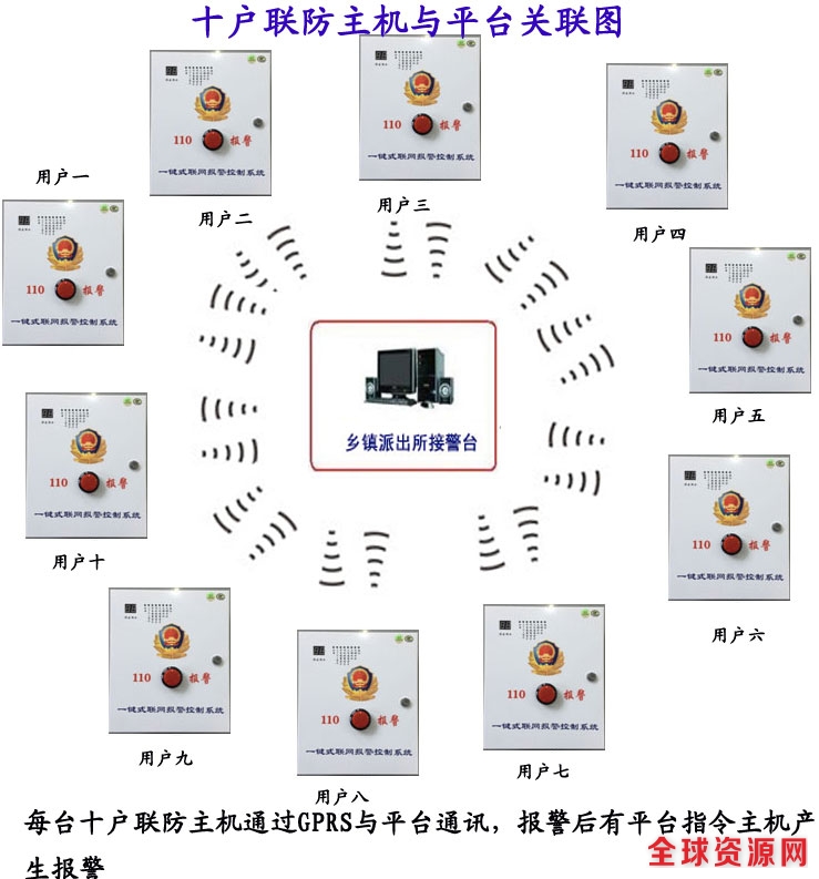 欣广安十户联防基于GPRS网络通讯技术,依托高并发分布式服务器,通过将若干个用户编成一个联防小组,每个用户安装一台联防主机,一旦联防小组中某户发生紧急求救报警,用户按下主机上红色紧急按钮,联防机通过GPRS方式将信息传输到服务器,同时联防小组中的其它主机会发出警笛声,并同时会播报:深圳市光明新区公明镇中英文小学紧急报警。(播报的内容可以在平台上设置。)警务站接警中心平台也会弹出报警信息并显示具体报警方位,真正实现5秒接警,1分钟出警,让犯罪暴徒无机可乘,从而实现群防群治、邻里互助的效果。